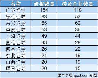 據犀牛之星App統(tǒng)計,2017年度,攢寫研究報告數量超過20篇的券商剛好有10家,其中廣證恒生、安信證券、東興證券(601198)、中泰證券、上海證券分別占據了前五,具體的券商攢寫研究報告數量及涉及企業(yè)數量如下: