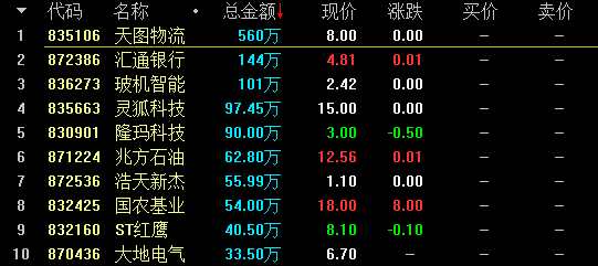 從成交額情況來看,基礎(chǔ)層企業(yè)天圖物流(835106)成交560萬元居首,同樣為基礎(chǔ)層企業(yè)的匯通銀行(872386)成交144萬元次之。