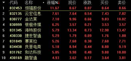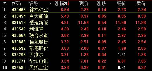 做市漲幅方面,創(chuàng)新層方面,恒福股份(832453)漲11.67%領(lǐng)漲做市股;基礎(chǔ)層企業(yè)中錦棉種業(yè)(430468)漲6.64%居于基礎(chǔ)層漲幅首位。