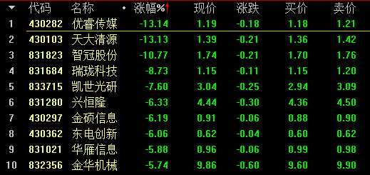 做市股跌幅榜方面,創(chuàng)新層中,瀚高股份(833644)跌8.22%居首;基礎(chǔ)層企業(yè)優(yōu)睿傳媒(430282)跌13.14%領(lǐng)跌做市股。