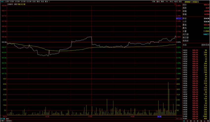 指數(shù)方面,三板做市(899002)今日以934.90點平開,開盤后一度震蕩下行,觸底933.47點后逐漸拉升并翻紅,最終報收935.37點,全天小漲0.05%。成分股全天成交5802萬元。