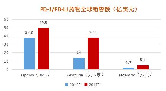 從上述獲批上市時間較早的Opdivo、Keytruda和Tecentriq來看,2016年全年,Opdivo銷售額超過37億美元,Keytruda銷售額超過14億美元。而2017年PD-1/L1抗體藥物全球銷售額已經(jīng)超過90億美元。