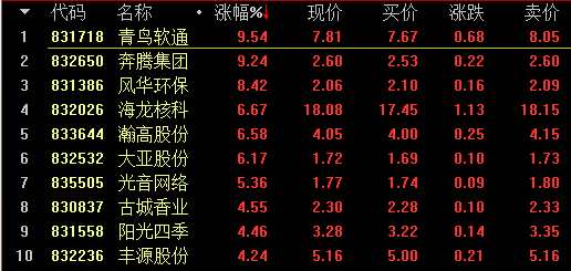 做市漲幅方面,創(chuàng)新層方面,青鳥(niǎo)軟通(831718)漲9.54%領(lǐng)漲做市股;基礎(chǔ)層企業(yè)科勝石油(430284)漲12%居首。