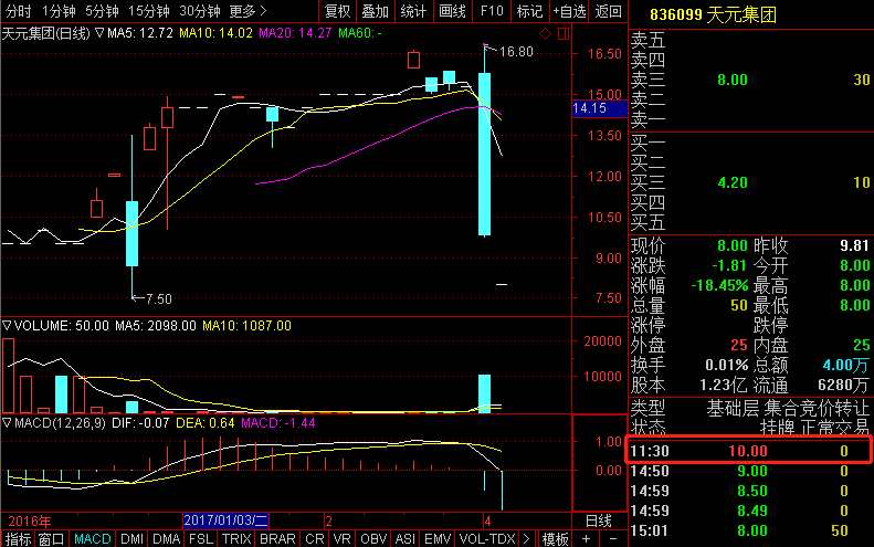 犀牛之星注意到,在天元集團盤面上,實際上有一筆報價最高為10元/股的買賣單,報價時間為早盤收盤。緊接著,排列下來的價格分別是9元、8.5元、8.49元。不過,這些價格均未能在收盤時撮合成交。