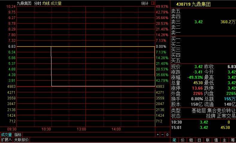 值得注意的是,九鼎為基礎層競價轉(zhuǎn)讓企業(yè),按照交易規(guī)則,下午三點,九鼎集團股票進行了全天唯一的一次撮合。