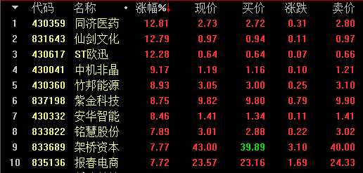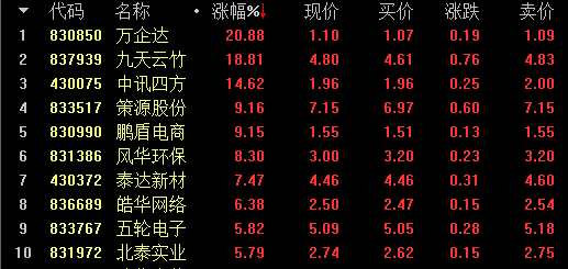 做市漲幅方面,創(chuàng)新層方面,萬企達(dá)(830850)漲20.88%領(lǐng)漲做市股;基礎(chǔ)層企業(yè)同濟(jì)醫(yī)藥(430359)漲12.81%居首。