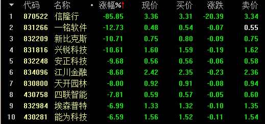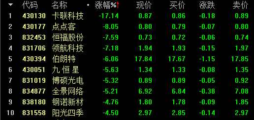 做市股跌幅榜方面,創(chuàng)新層中,卡聯(lián)科技(430130)跌17%居首;基礎(chǔ)層企業(yè)信隆行(870522)跌85.85%領(lǐng)跌做市股。