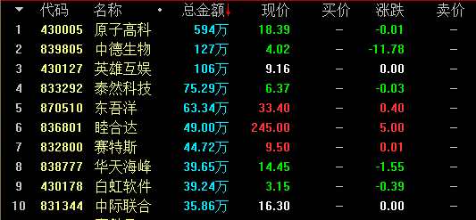 (創(chuàng)新層競價(jià)交易股票盤內(nèi)成交額前十名)