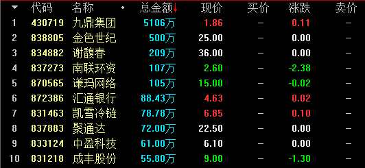 從成交總額情況來看,九鼎集團(tuán)(430719)成交5106萬元居首,股價(jià)報(bào)1.86元/股,漲幅6.29%。