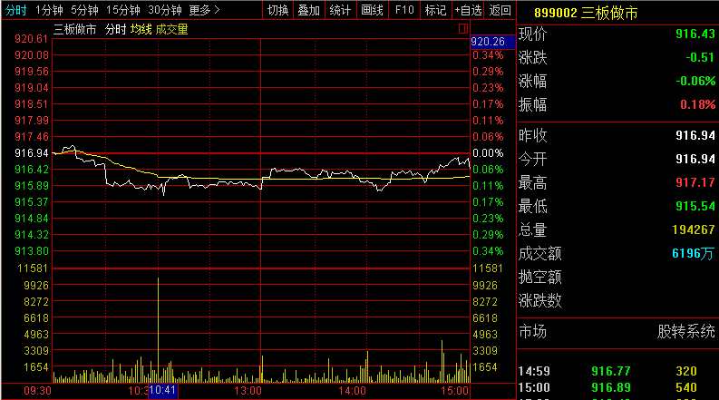 指數(shù)方面,三板做市(899002)今日以916.94點(diǎn)平開,開盤指數(shù)回落,隨后保持低位震蕩,收盤報(bào)916.43點(diǎn),跌0.06%。成分股全天成交6196萬元。
