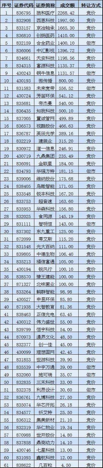 累計(jì)成交金額前五名的新三板企業(yè)分別為:狼和醫(yī)療(836795)成交2268.42萬元、西恩科技(832908)成交1997.00萬元、京冶軸承(833157)成交1665.30萬元、創(chuàng)揚(yáng)醫(yī)藥(836810)成交1410.00萬元、合全藥業(yè)(832159)成交1400.10萬元。