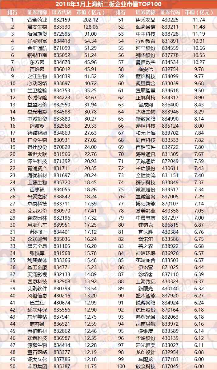 報(bào)告 | 2018年3月上海新三板企業(yè)市值TOP100