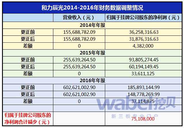 挖貝網(wǎng)注意到,和力辰光掛牌新三板期間對2014年、2015年、2016年、2017年1-6月財報中的多項(xiàng)財務(wù)數(shù)據(jù)進(jìn)行了更正,其中變動最大的要數(shù)凈利潤一項(xiàng)。財務(wù)數(shù)據(jù)更正后,2014年、2015年、2016年和力辰光歸屬于掛牌公司股東的凈利潤分別縮水438.2萬元、3361.11萬元、3711.49萬元,3年凈利潤合計縮水7510.8萬元。