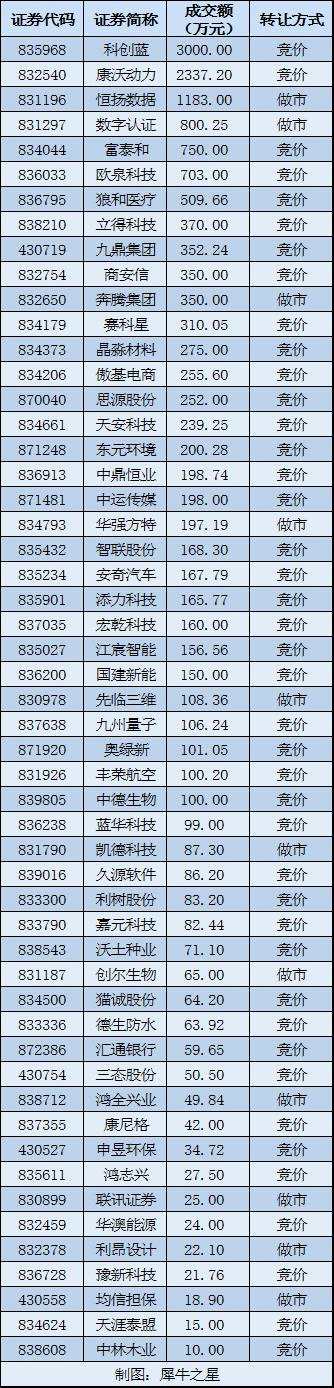 累計成交金額前五名的新三板企業(yè)分別為:科創(chuàng)藍(835968)成交3000萬、康沃動力(832540)成交2337.20萬、恒揚數(shù)據(jù)(831196)成交1182萬、數(shù)字認證(300579)(831297)成交800.25萬、富泰和(834044)成交750萬。