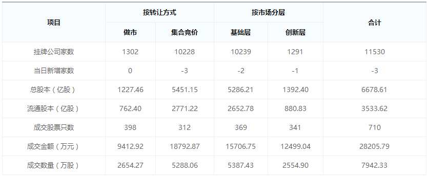 4月12日,創(chuàng)新層、基礎(chǔ)層分別成交1.25億元和1.57億元,合計成交2.82億元。