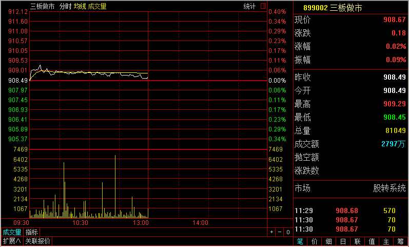 指數(shù)方面,三板做市(899002)今日以908.49點平開,開盤后指數(shù)小幅上揚。隨后一路小幅震蕩,截至11:30,做市指數(shù)報908.67點,微漲0.02%,成分股上午成交2797萬萬元。
