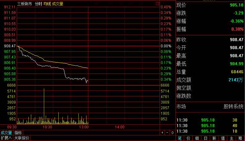 指數(shù)方面,三板做市(899002)今日以908.47點平開,指數(shù)開盤后持續(xù)陰跌直至早盤收盤,盤中幾無反彈,截至收盤做市指數(shù)報收905.18點,跌幅為0.36%,成分股半天成交2143萬元。