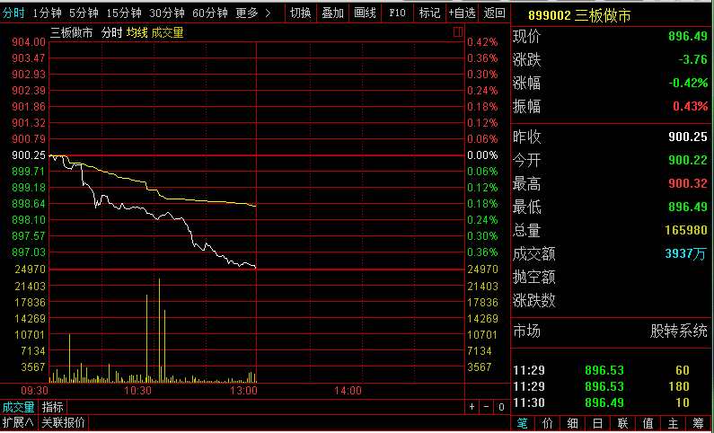 指數(shù)方面,三板做市(899002)早盤(pán)以900.25點(diǎn)平開(kāi),指數(shù)開(kāi)盤(pán)后持續(xù)陰跌直至早盤(pán)收盤(pán),并于收盤(pán)創(chuàng)下早盤(pán)最低點(diǎn)896.49點(diǎn),漲幅為-0.42%,成分股半天共成交3937萬(wàn)元。