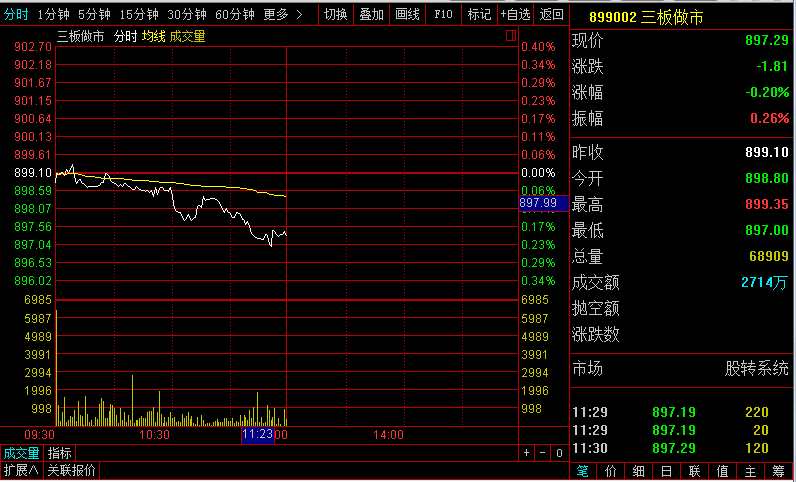 指數(shù)方面,三板做市(899002)早盤以899.10點(diǎn)平開(kāi),指數(shù)開(kāi)盤小幅震蕩后再次保持陰跌下行,截至早盤收盤,指數(shù)報(bào)收897.29點(diǎn),漲幅為-0.20%,成分股半天共成交2714萬(wàn)元。