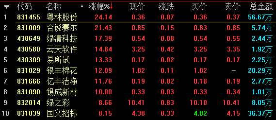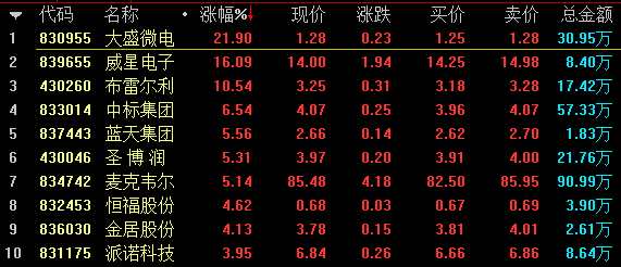 做市漲幅方面,基礎(chǔ)層企業(yè)粵林股份(831455)漲24.14%領(lǐng)漲做市股;創(chuàng)新層方面,大盛微電(830955)漲21.90%居于創(chuàng)新層漲幅榜首。