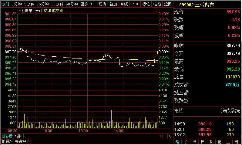 指數(shù)方面,三板做市(899002)今日以897.79點(diǎn)平開,指數(shù)開盤小幅拉升后快速回落,而后持續(xù)弱勢(shì)震蕩,臨近收盤快速拉升并最終翻紅,指數(shù)收盤報(bào)收897.96點(diǎn),漲幅為0.02%,成分股全天成交4700萬元。