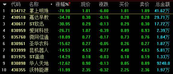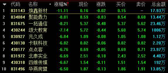 做市股跌幅榜方面,基礎(chǔ)層企業(yè)掌上明珠(834712)大跌78.98%領(lǐng)跌做市股;創(chuàng)新層方面,煥鑫新材(831143)跌11.11%居創(chuàng)新層跌幅榜首。