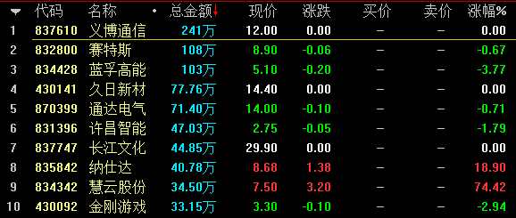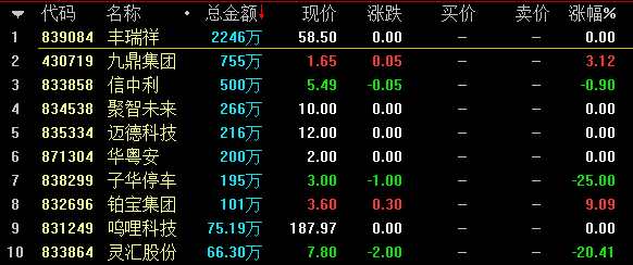 從成交額情況來看,基礎(chǔ)層企業(yè)豐瑞祥(839084)成交2246萬元位于競(jìng)價(jià)交易榜首,同為基礎(chǔ)層的九鼎集團(tuán)(430719)成交755萬元次之;創(chuàng)新層方面,成交額最高的是義博通信(837610),今日成交241萬元。