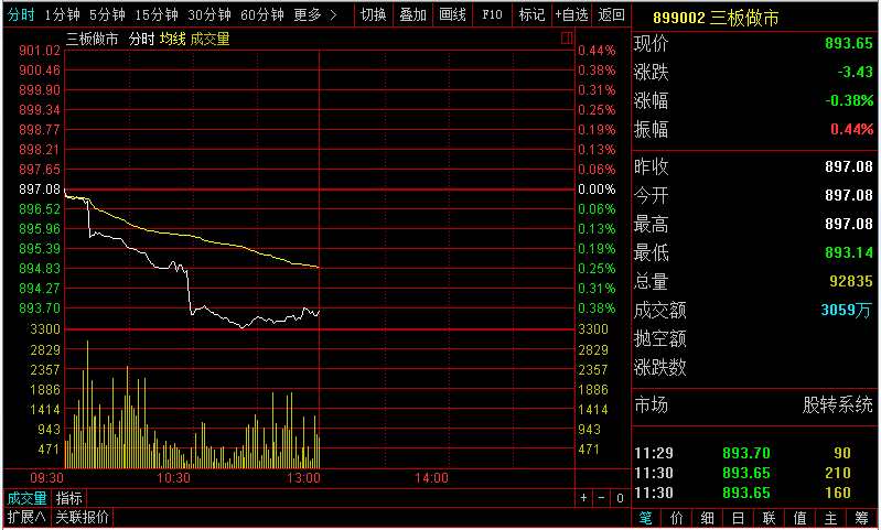 指數(shù)方面,三板做市(899002)早盤以897.08點(diǎn)平開,指數(shù)開盤后不久便遭遇快速下跌,而后企穩(wěn)維持窄幅震蕩,截至早盤收盤,指數(shù)報(bào)收893.65點(diǎn),漲幅為-0.38%,成分股半天共成交3059萬元。