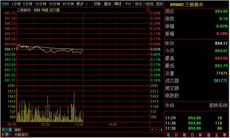 指數(shù)方面,三板做市(899002)早盤以894.07點小幅低開,指數(shù)開盤小幅拉升后回落,而后維持窄幅震蕩,截至早盤收盤,指數(shù)報收894.00點,漲幅為-0.02%,成分股半天共成交2617萬元。
