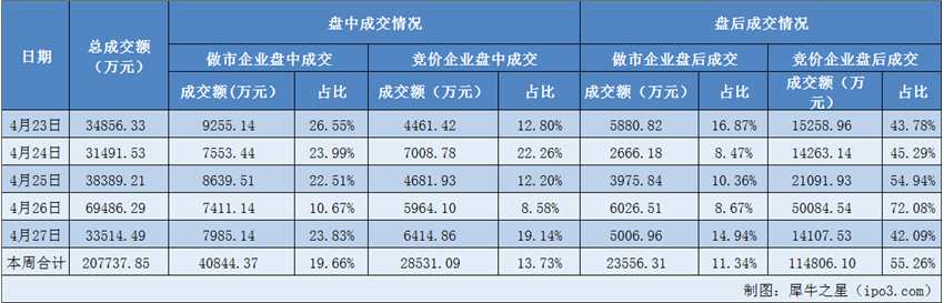 一、本周交易情況 本周(4月23日-4月27日)新三板市場(chǎng)交易總額為20.77億元,其中盤內(nèi)成交6.94億元,盤后大宗交易成交13.83億元。