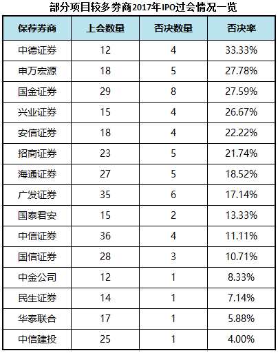 而日前,證監(jiān)會公布了2017年IPO保薦機構(gòu)的整體情況,國金證券的“成績單”也不算好看。數(shù)據(jù)表明,2017年證監(jiān)會發(fā)審委共審核466個IPO項目,審核通過380家,否決86家。