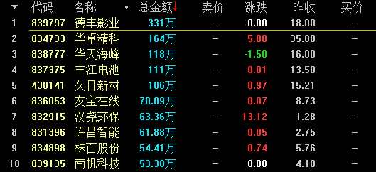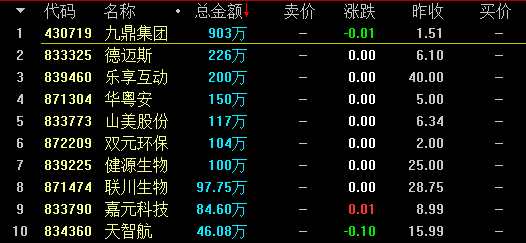 從成交額情況來(lái)看,基礎(chǔ)層企業(yè)九鼎集團(tuán)(430719)成交903萬(wàn)元位于競(jìng)價(jià)交易榜首,創(chuàng)新層企業(yè)德豐影業(yè)(839797)成交331萬(wàn)元次之。