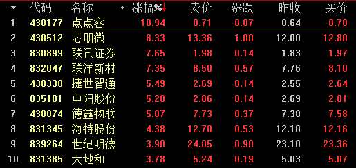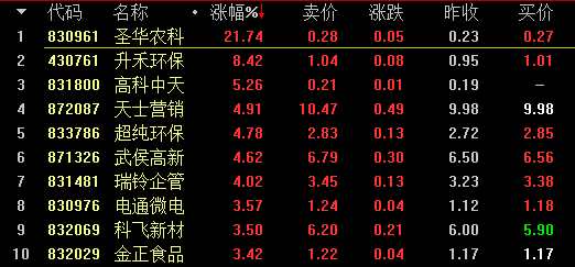 做市漲幅方面,基礎(chǔ)層企業(yè)圣華農(nóng)科(830961)漲21.74%領(lǐng)漲做市股;創(chuàng)新層方面,點(diǎn)點(diǎn)客(430177)漲10.94%居于創(chuàng)新層漲幅榜首。