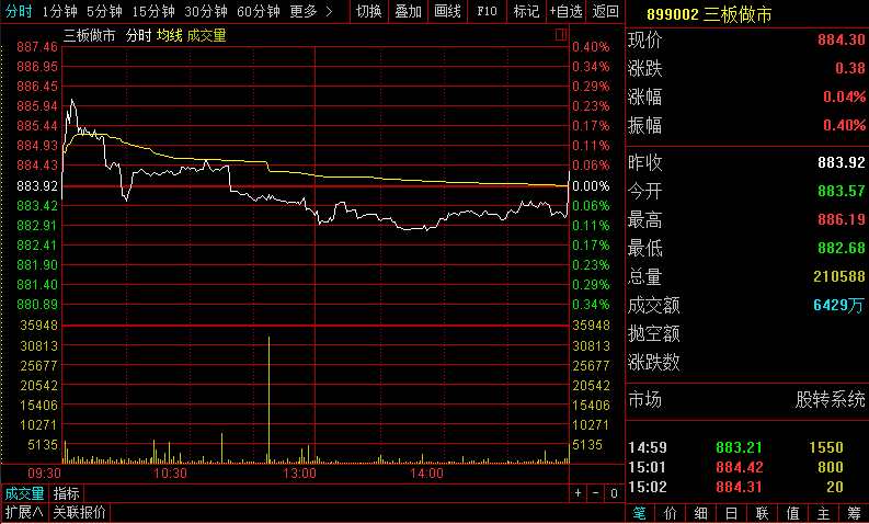 指數(shù)方面,三板做市(899002今日以887.57點(diǎn)小幅低開(kāi),開(kāi)盤后迅速拉升,觸頂886.19點(diǎn)后開(kāi)始震蕩下行,隨后于盤中維持橫盤震蕩,截至收盤迅速拉升并翻紅,最終報(bào)收884.30點(diǎn),漲幅為0.04%,成分股全天共成交6429萬(wàn)元。