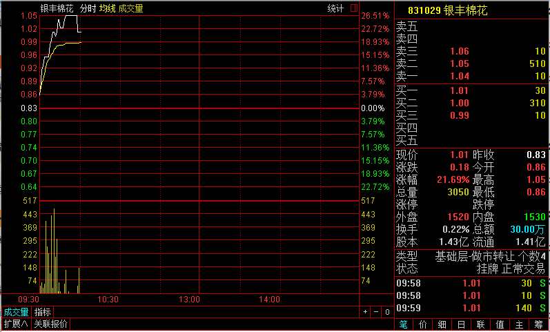 5月7日,早盤開盤,銀豐棉花(831029)出現(xiàn)暴漲,截至10:02,銀豐棉花股價(jià)報(bào)1.01元/股,漲幅為21.69%。