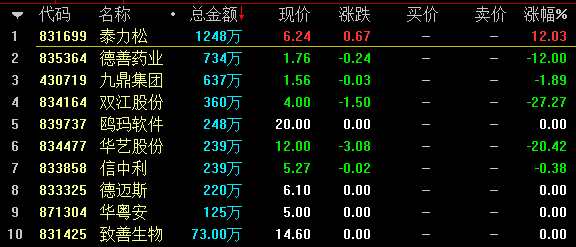 從成交額情況來看,基礎(chǔ)層企業(yè)泰力松(831699)成交1248萬元位于競價交易榜首,同為基礎(chǔ)層的德善藥業(yè)(835364)成交734萬元次之;創(chuàng)新層方面,成交額最高的是久日新材(430141),今日成交197萬元。