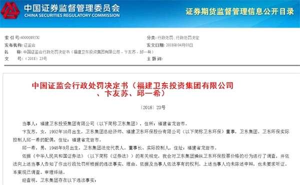 最終,證監(jiān)會(huì)對(duì)衛(wèi)東集團(tuán)處以100萬(wàn)元罰款;對(duì)卞友蘇給予警告,并處以30萬(wàn)元罰款;對(duì)邱一希給予警告,并處以15萬(wàn)元罰款。