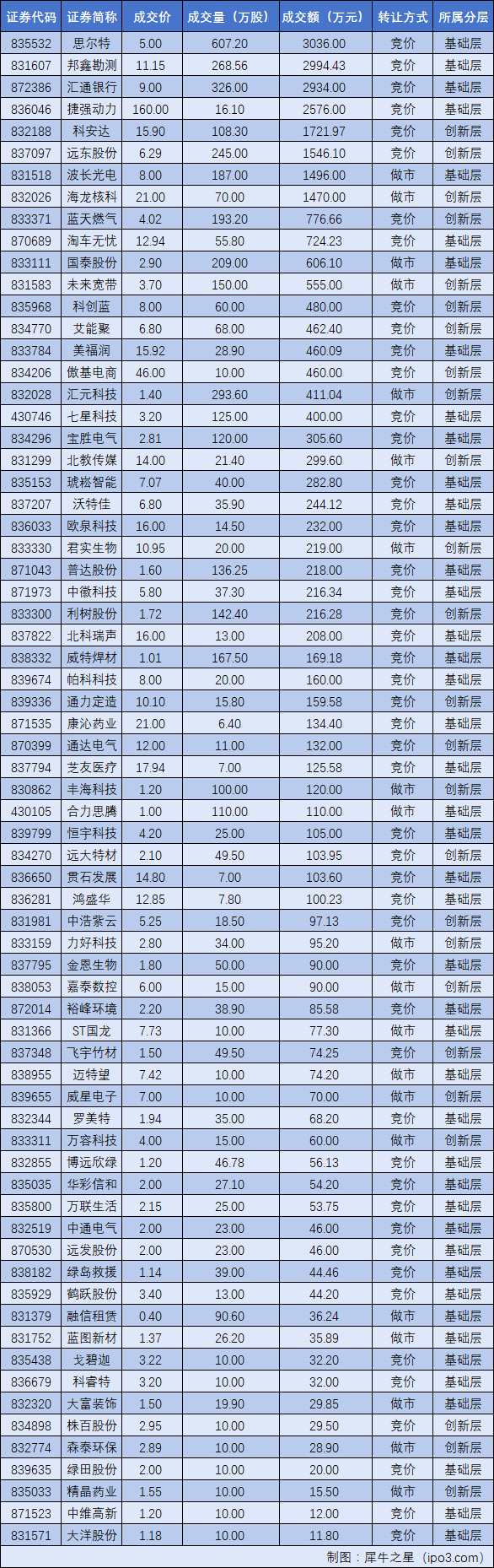 累計成交金額前五名的新三板企業(yè)分別為:思爾特(835532)成交3036.00萬元、邦鑫勘測(831607)成交2994.43萬元、匯通銀行(872386)成交2934.00萬元、捷強動力(836046)成交2576.00萬元、科安達(832188)成交1721.97萬元。
