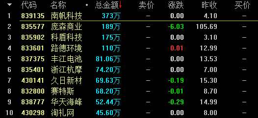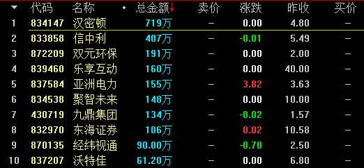 從成交額情況來看,基礎(chǔ)層企業(yè)漢密頓(834147)成交719萬元位于競價交易榜首,同為基礎(chǔ)層的信中利(833858)成交407萬元次之;創(chuàng)新層方面,成交額最高的是南帆科技(839135),今日成交373萬元。