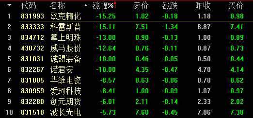 做市股跌幅榜方面,基礎(chǔ)層企業(yè)歐克精化(831993)跌15.25%領(lǐng)跌做市股;創(chuàng)新層方面,爹地寶貝(834683)跌11.35%居創(chuàng)新層跌幅榜首。