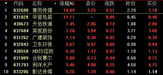 做市漲幅方面,基礎(chǔ)層企業(yè)青雨傳媒(832698)漲18.89%領(lǐng)漲做市股;創(chuàng)新層方面,麥克韋爾(834742)漲17.32%居于創(chuàng)新層漲幅榜首。