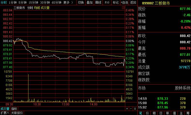 指數(shù)方面,三板做市(899002)今日以877.83點小幅低開,開盤小幅下行后開始震蕩上揚,截至收盤,指數(shù)報收879.55點,漲幅為0.18%,成分股全天共成交4671萬元。