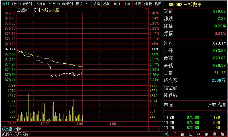 指數(shù)方面,三板做市(899002)早盤(pán)以873.06點(diǎn)小幅低開(kāi),指數(shù)開(kāi)盤(pán)后持續(xù)震蕩下跌至早盤(pán)收盤(pán),最終報(bào)收870.89點(diǎn),漲幅為-0.26%,成分股半天共成交2838萬(wàn)元。