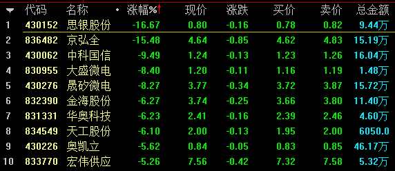 做市股跌幅榜方面,基礎層企業(yè)天健生物(834979)跌66.55%領跌做市股;創(chuàng)新層方面,思銀股份(430152)跌16.67%居創(chuàng)新層跌幅榜首。