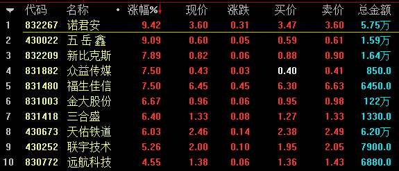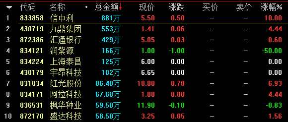 從成交額情況來看,基礎層企業(yè)信中利(833858)成交881萬元位于競價交易榜首,同為基礎層的九鼎集團(430719)成交553萬元次之;創(chuàng)新層方面,成交額最高的是海南沉香(834155),今日共成交493萬元。