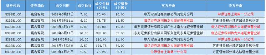 5月9日,嘉合智能發(fā)生一筆大宗交易,交易價(jià)格為10元/股,交易量為11萬股,該筆交易的賣方營(yíng)業(yè)部正是中原證券上海第一分公司;5月11日,嘉合智能分別以8元/股和10元/股的價(jià)格成交10萬股和39.90萬股,而這兩筆大宗交易的賣方營(yíng)業(yè)部均為信達(dá)證券深圳梅龍大道證券營(yíng)業(yè)部。