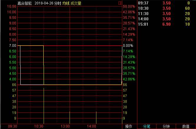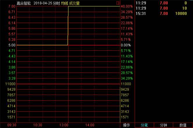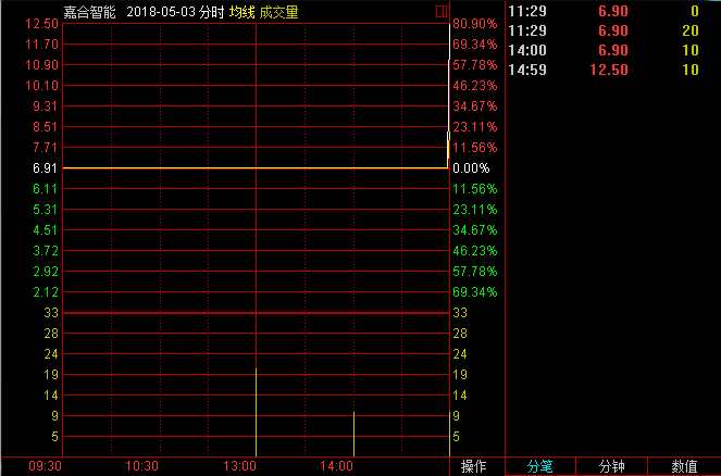 隨后幾日,嘉合智能收盤價(jià)持續(xù)走高,4月26日,嘉合智能前四次集合競(jìng)價(jià)撮合價(jià)格均為3.50元,臨近收盤股價(jià)突升,以6.90元/股的價(jià)格成交1000股;5月3日,這一現(xiàn)象再次上演,當(dāng)日盤中有三次撮合交易以6.90元/股的價(jià)格成交,但臨近收盤,即14:59,嘉合智能以12.50元/股的價(jià)格成交1000股,股價(jià)瞬間暴漲81.16%。