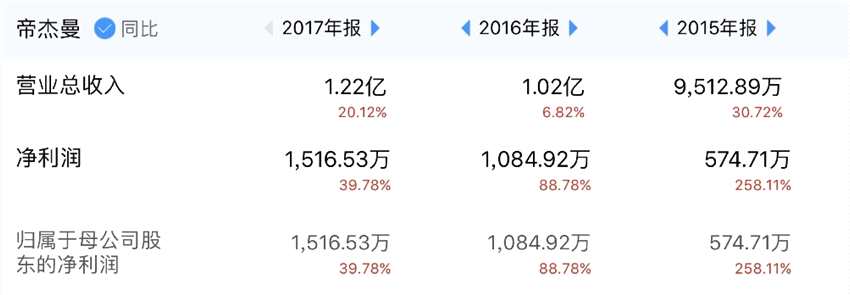 近三年來,帝杰曼業(yè)績增長勢頭不錯。2015年至2017年,公司營業(yè)收入自9513萬增長至1.22億。凈利潤自575萬增長至1517萬。