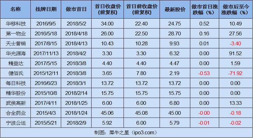 注:華移科技做市前僅有一筆交易,做市首日漲幅51.79%參考意義不大。