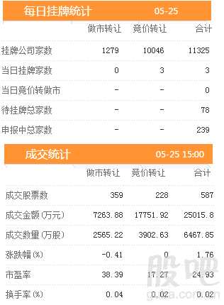 25日新增掛牌企業(yè)3家,掛牌企業(yè)總數(shù)達(dá)到11325家,截至2018年5月25日,掛牌企業(yè)總數(shù)達(dá)到11325家。
